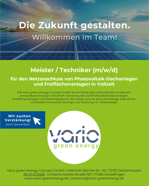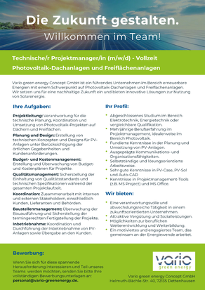Wenn Sie sich für diese spannende Herausforderung interessieren und Teil unseres Teams bei Vario green energy Concept GmbH werden möchten, senden Sie bitte Ihre vollständigen Bewerbungsunterlagen an: